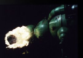 The first, in Backwards, was achieved with video effects (plus some blue screen to show some fish swimming past the cockpit's viewscreen). The second was onto an ice planet constructed in miniature and filmed, as ever, on 35mm film stock in order to slow the footage down. The cause of the crash, a flaming meteorite, was dropped from above the upward-facing ship and filmed sideways on - thus giving the illusion of forward motion to the meteorite, and making the flames flick in a manner that implied zero gravity.