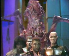 Meanwhile, the backwards photography trick was used one more time to make the shami kebab appear to be throttling Lister. Low tech or not, it remained more effective than the unfortunate substitution of a blatantly fake snake for its live counterpart during the later part of the sequence.