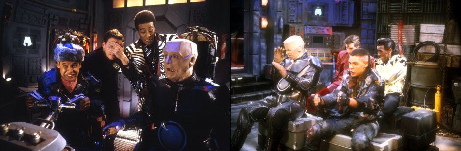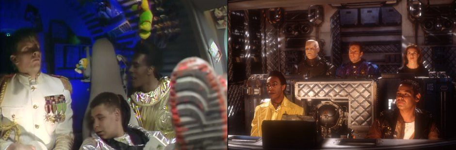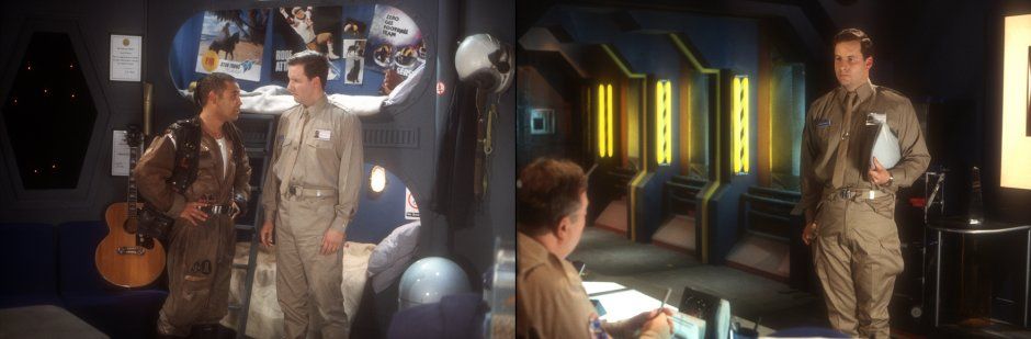 One final change for Series VIII was that, with Starbug destroyed, the crew needed a new shuttle craft cockpit. Blue Midget had had a cramped feel way back in its very first appearances in Series II, and although enlarged for Series VIII, that continued by virtue of the sheer number of characters that were crammed into it. The layout was actually, more than anything, reminiscent of Series II's science room - with characters directly facing the camera rather than the angled perspective of Starbug's cockpit.