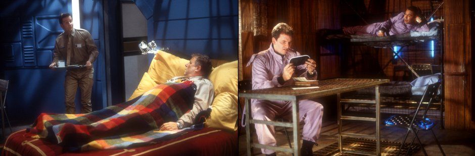 Not that our intrepid crew got to see very much of this new ship, of course - the arching series plot of their imprisonment in "The Tank" meant that instead, another entirely new set was required. Putting Lister and Rimmer back in stacked bunks, with a foreground table, the prison cell deliberately evoked that very first bunkroom - the same one the audience had been shown in Back in the Red Part 1, helping drive home the subliminal image - while the metallic grates called to mind the classic ship's corridors.